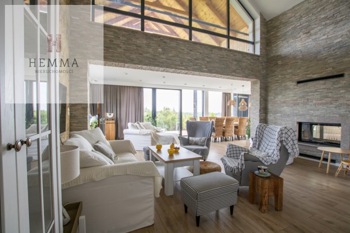 - Otwartego salonu z kuchnią: Zabudowa meblowa, kuchenka z okapem, lodówka, zlewozmywak, panoramiczne okno z widokiem na pokój z jacuzzi.