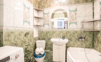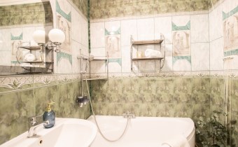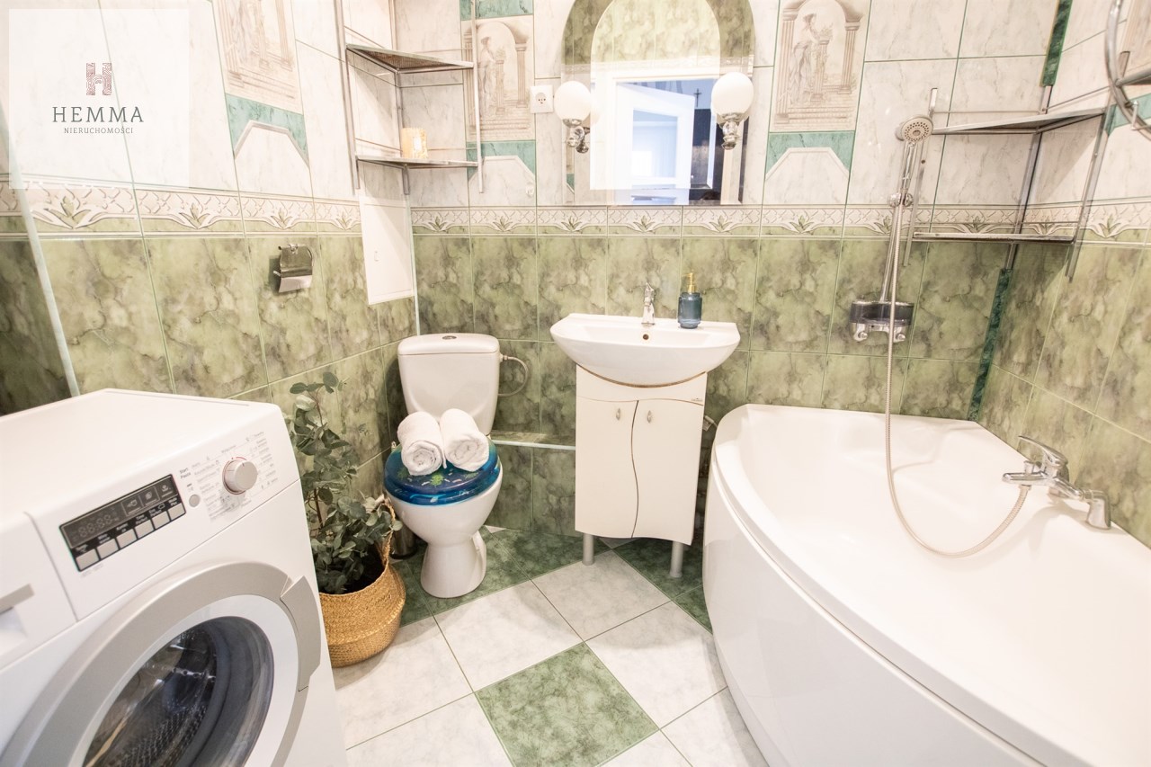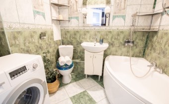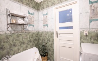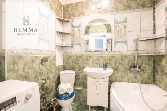 - Łazienka - znajdziemy tutaj dużą narożną wannę, zlew z szafką, lustro, WC, miejsce na podłączenie pralki oraz przestrzeń na dodatkowe meble łazienkowe