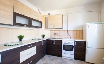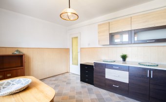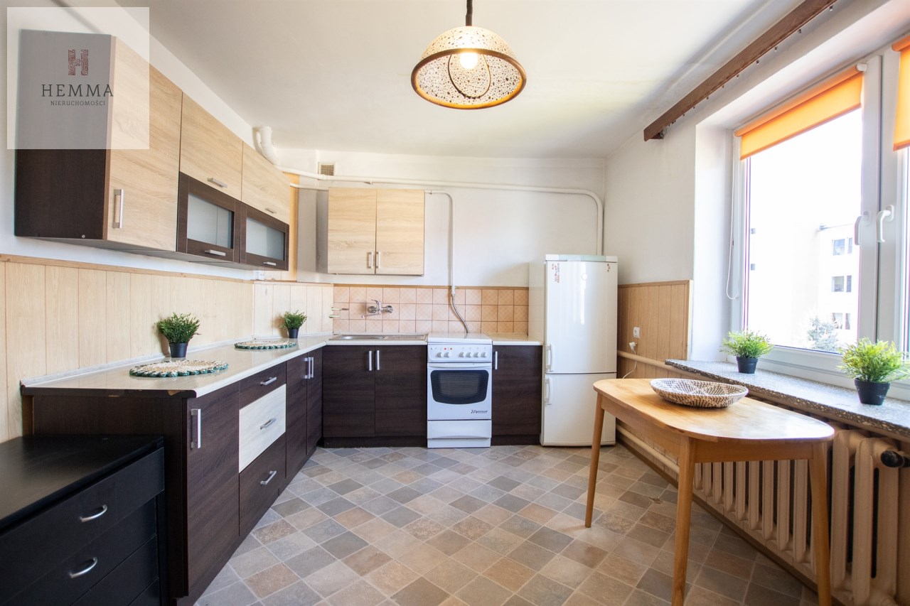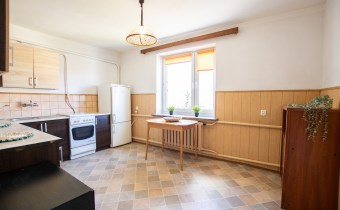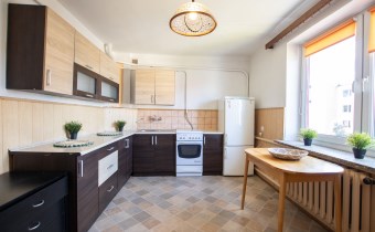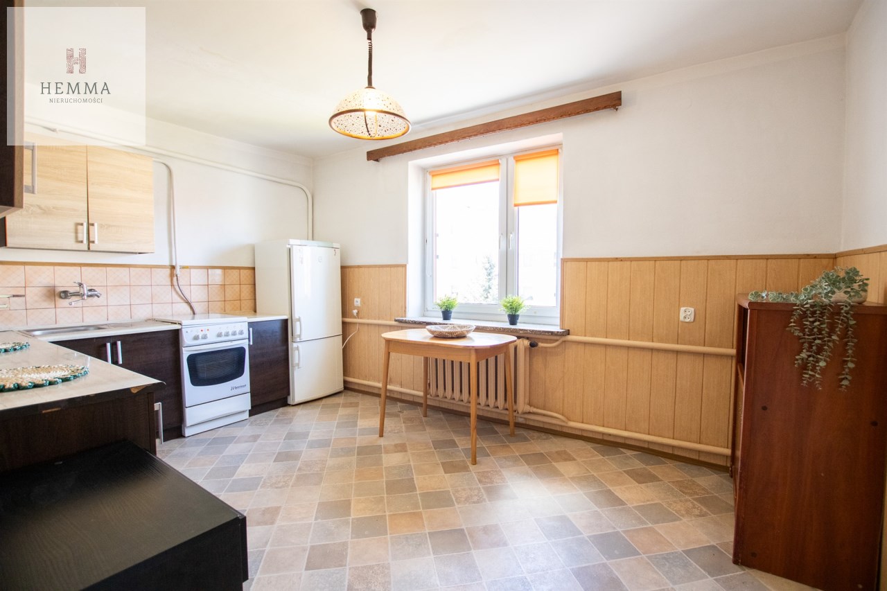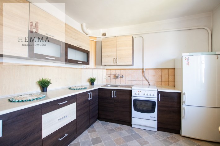-Kuchnia: zabudowa meblowa, stół, lodówka, kuchenka gazowa, zlewozmywak, komoda, szafka.