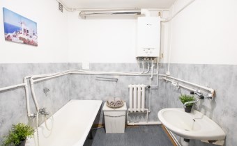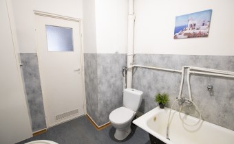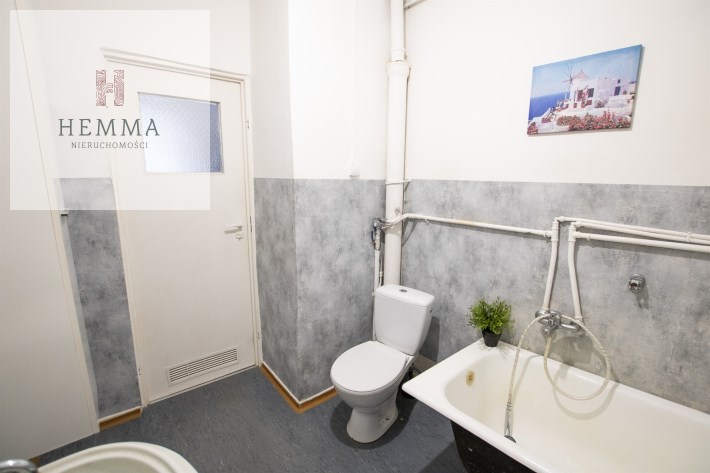 -Łazienka: wanna, zlew, WC, szafka łazienkowa.