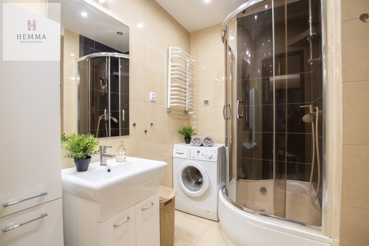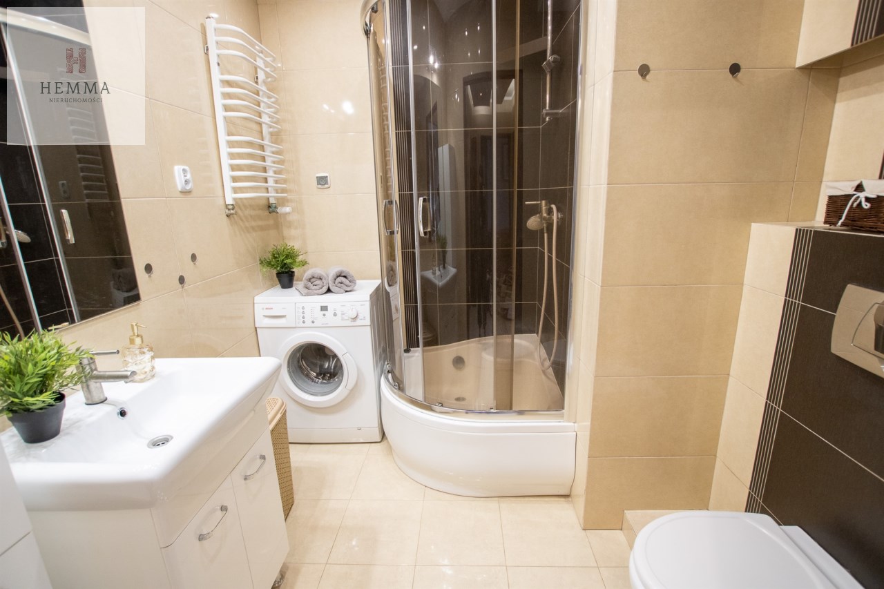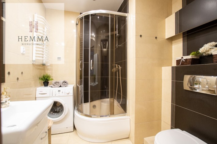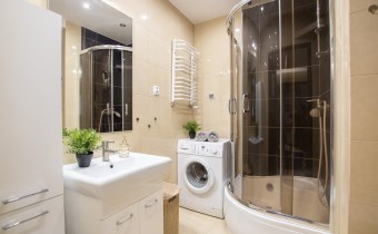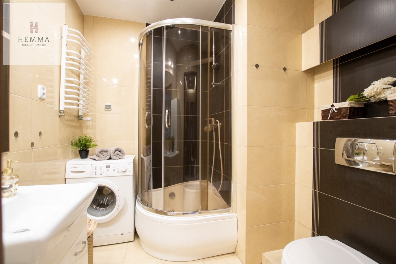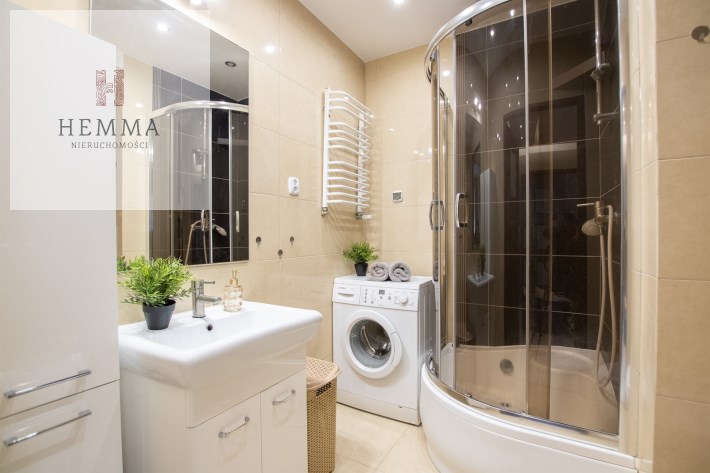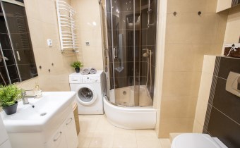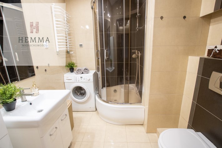 -Łazienka- przestronna z prysznicem, wc, zlewem z szafką, lustrem, szafką łazienkową i  pralką,