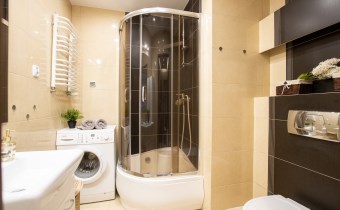 Wyposażenie łazienki WC, pralka, lustro, kabina prysznicowa