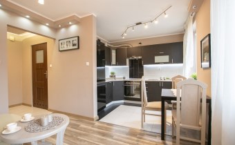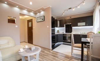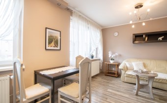 -Pokój 1- duży salon z aneksem kuchennym, miejscem jadalnianym, i wyjściem na balkon; w pokoju znajdziemy dużą kanapę, stolik kawowy i półkę,