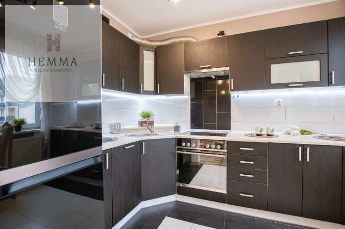 -Kuchnia - jest otwarta i wyposażona w meble kuchenne i sprzęty takie jak lodówka, piekarnik, płyta indukcyjna, pochłaniacz, zmywarka i zlewozmywak,