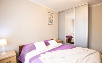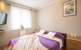 -Pokój 2- sypialnia z dużym łóżkiem, dwiema małymi szafkami przy nim, szafą z lustrem pod zabudowę i telewizorem.