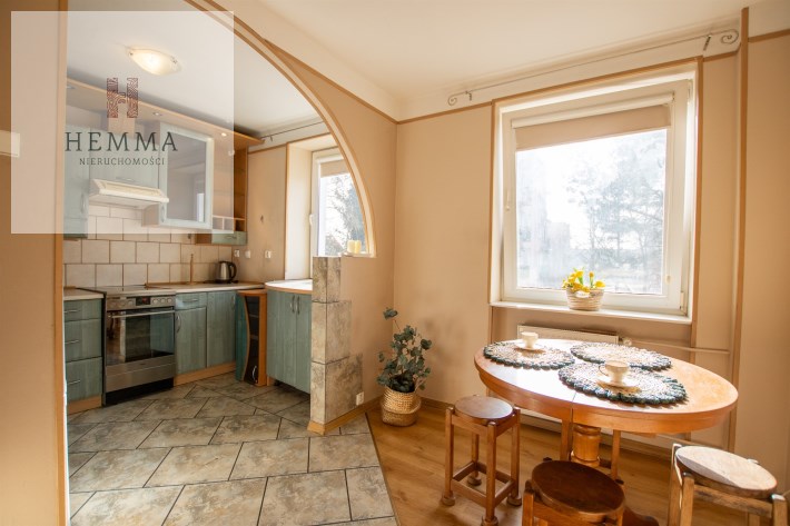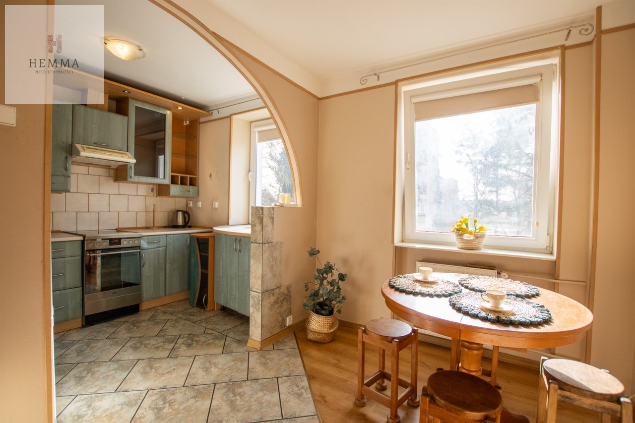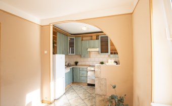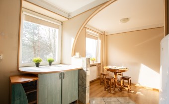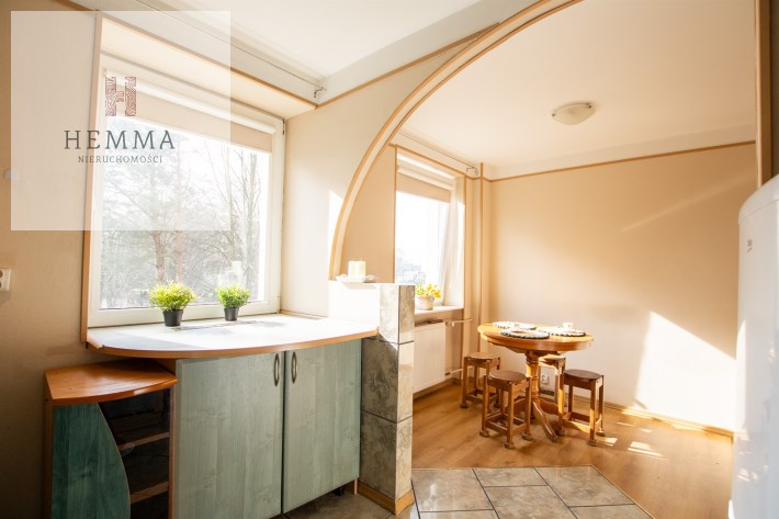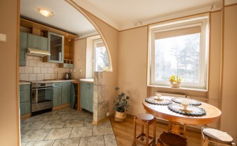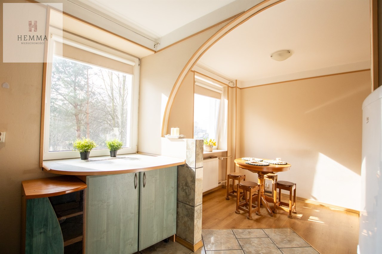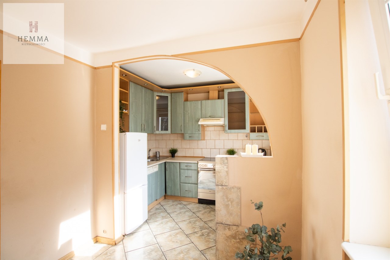 -Kuchnia: oddzielna, duża, jasna, z częścią jadalnianą; w tym pomieszczeniu znajdują się dwa okna z widokiem na zieleń; znajdują się tutaj meble kuchenne, zmywarka, lodówka i kuchenka,
