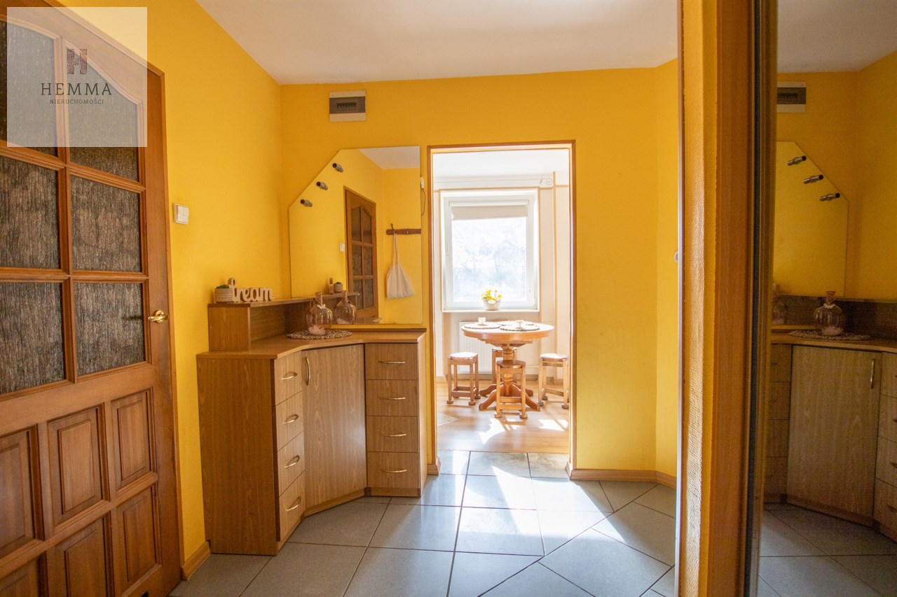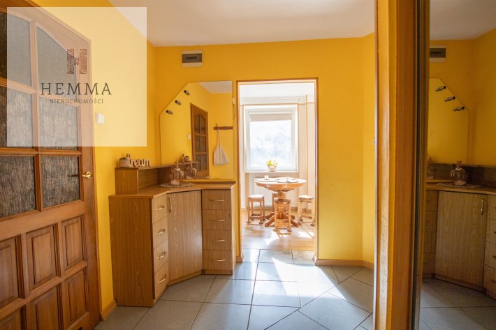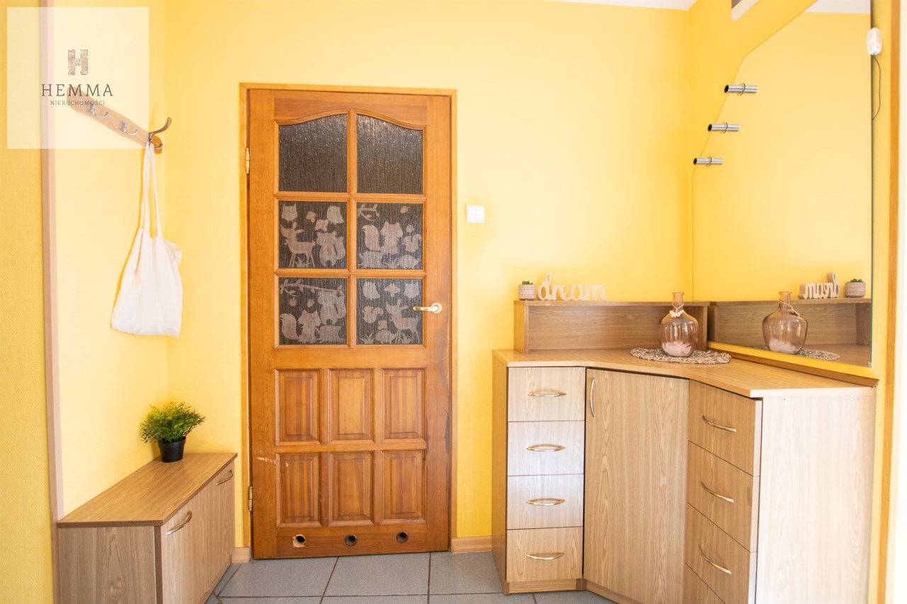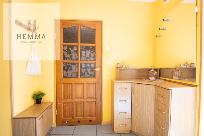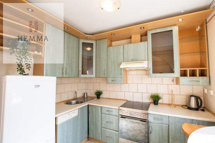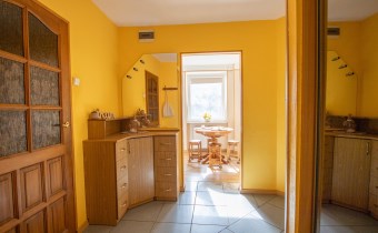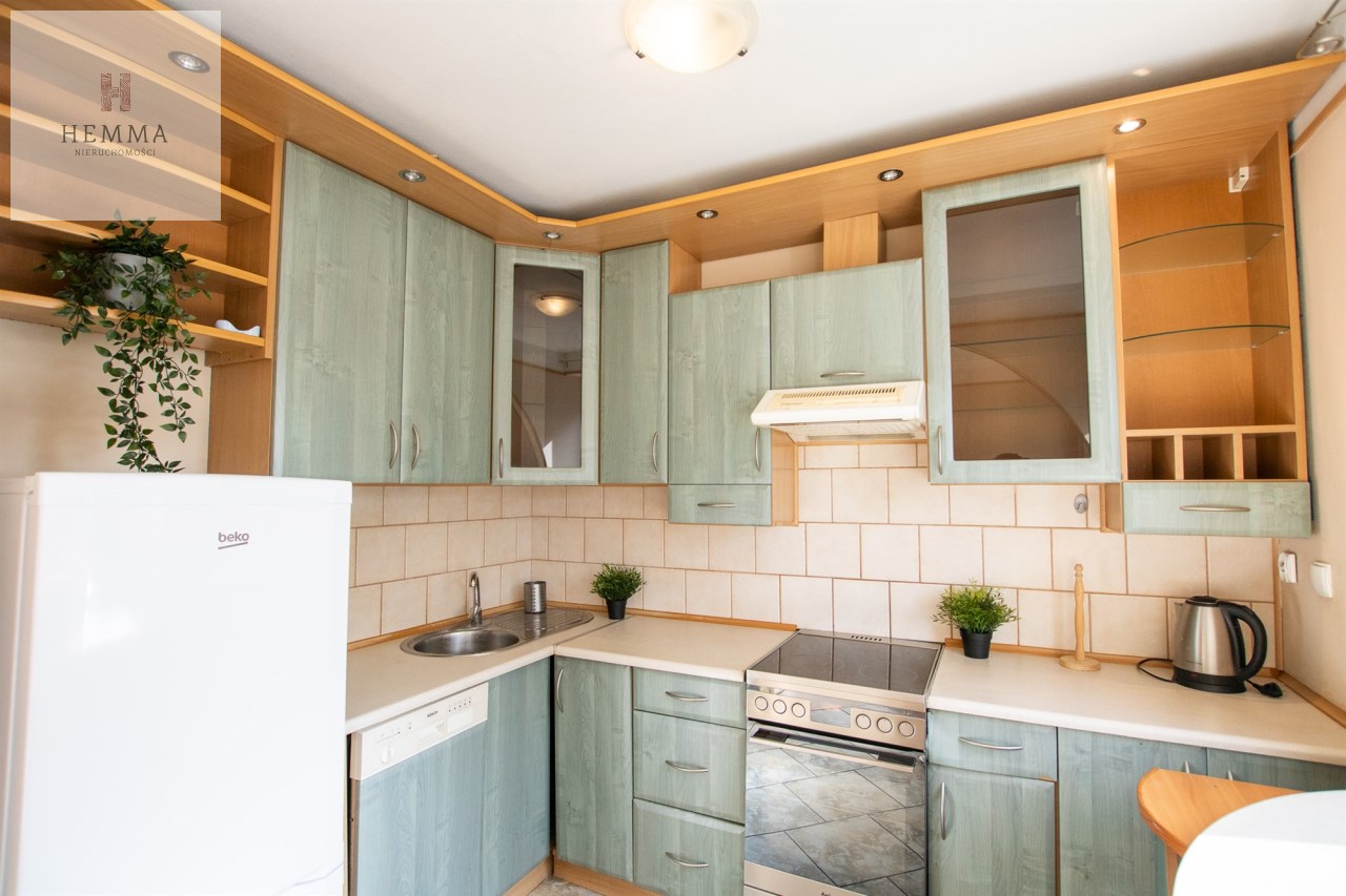 -Kuchnia: oddzielna, duża, jasna, z częścią jadalnianą; w tym pomieszczeniu znajdują się dwa okna z widokiem na zieleń; znajdują się tutaj meble kuchenne, zmywarka, lodówka i kuchenka,