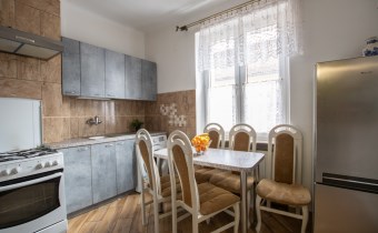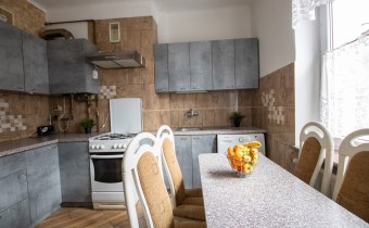 - Kuchnia : Zabudowa meblowa, kuchenka z okapem,zlewozmywak, lodówka, stół z miejscem dla pięciu osób