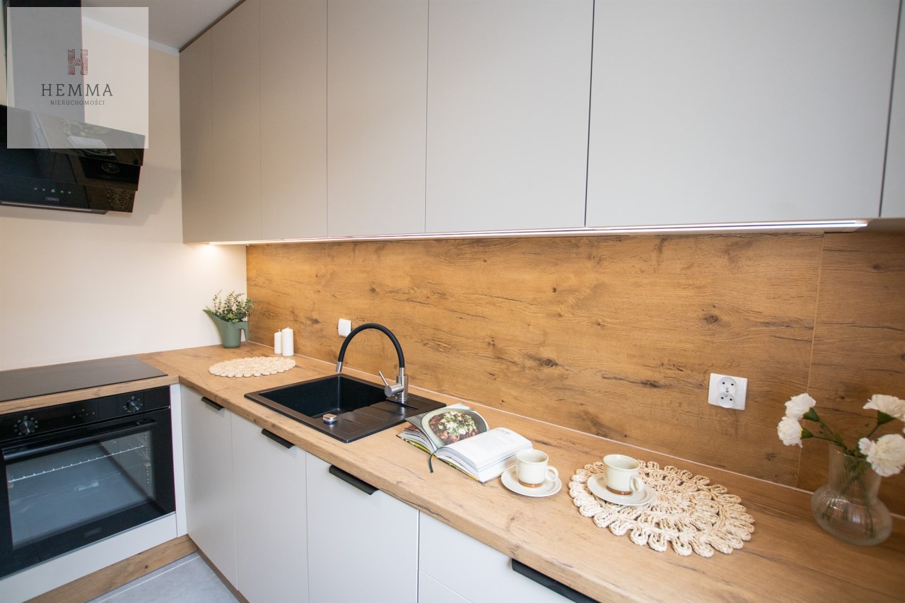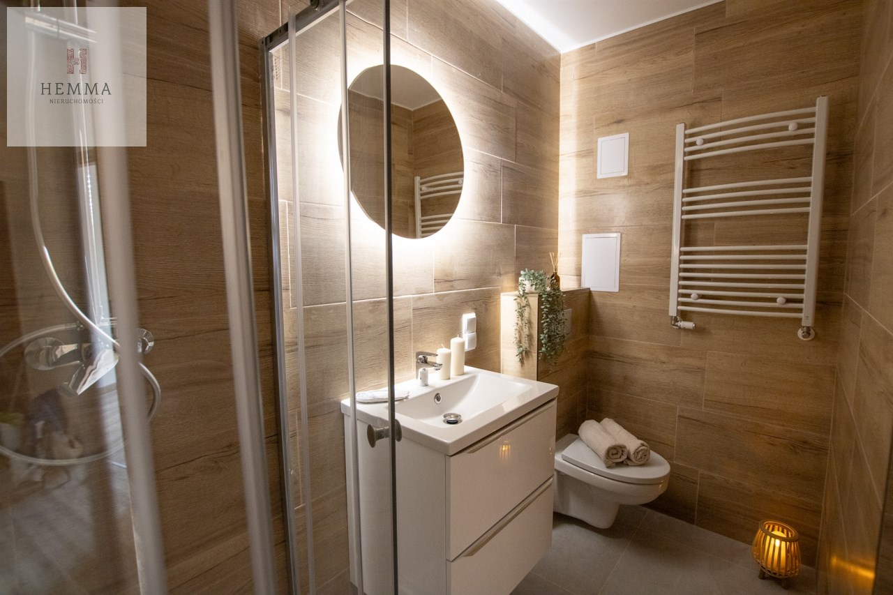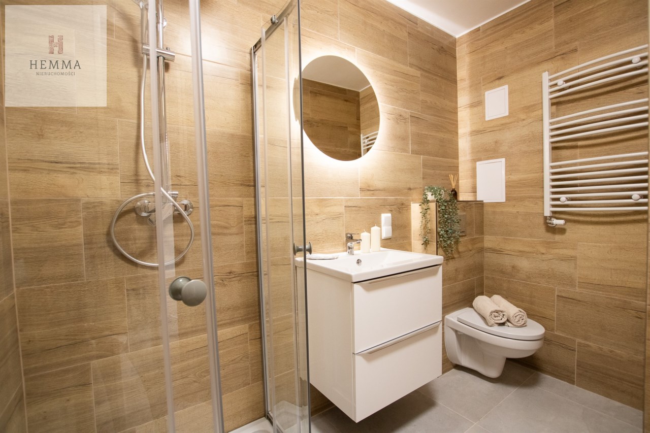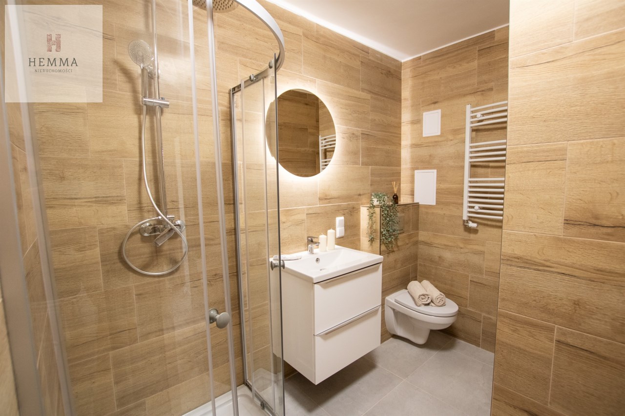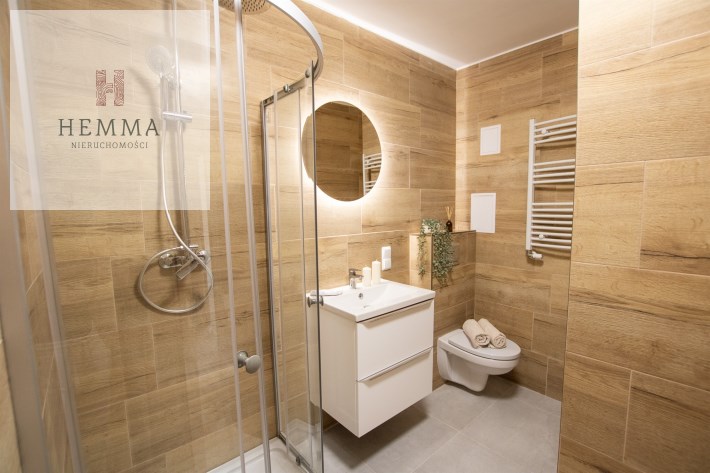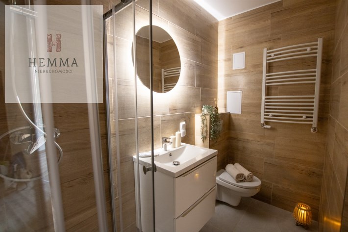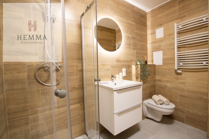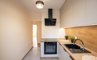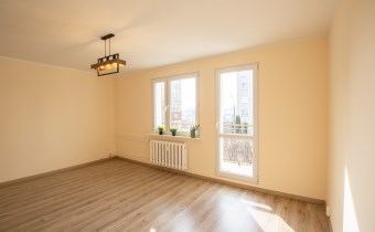 Całe mieszkanie jest świeżo po remoncie, ściany i sufity zostały wyszpachlowane, pomalowane, na podłogach znajdują się nowe panele, instalacja wymieniona. Łazienka i kuchnia jest po generalnym remoncie, nowe płytki gresowe, wymieniona hydraulika, nowa kabina prysznicowa, zlew, szafka, WC, w kuchni nowe meble i sprzęty.