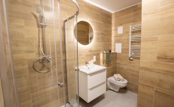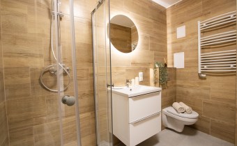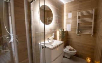 -Łazienka: wyposażona w prysznic, zlew z szafką, lustro, WC,
