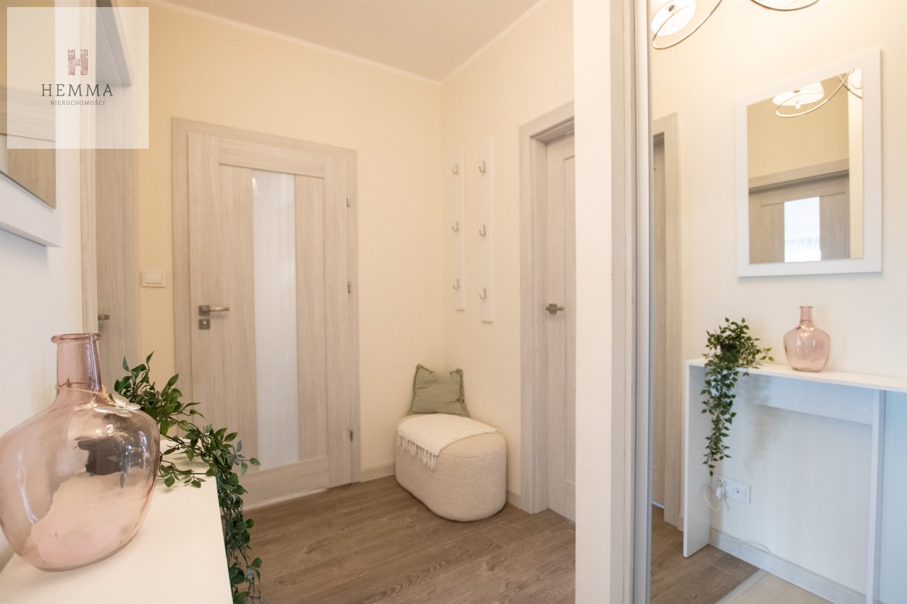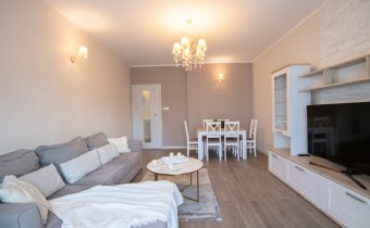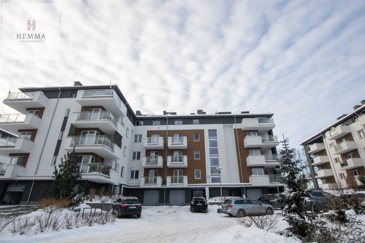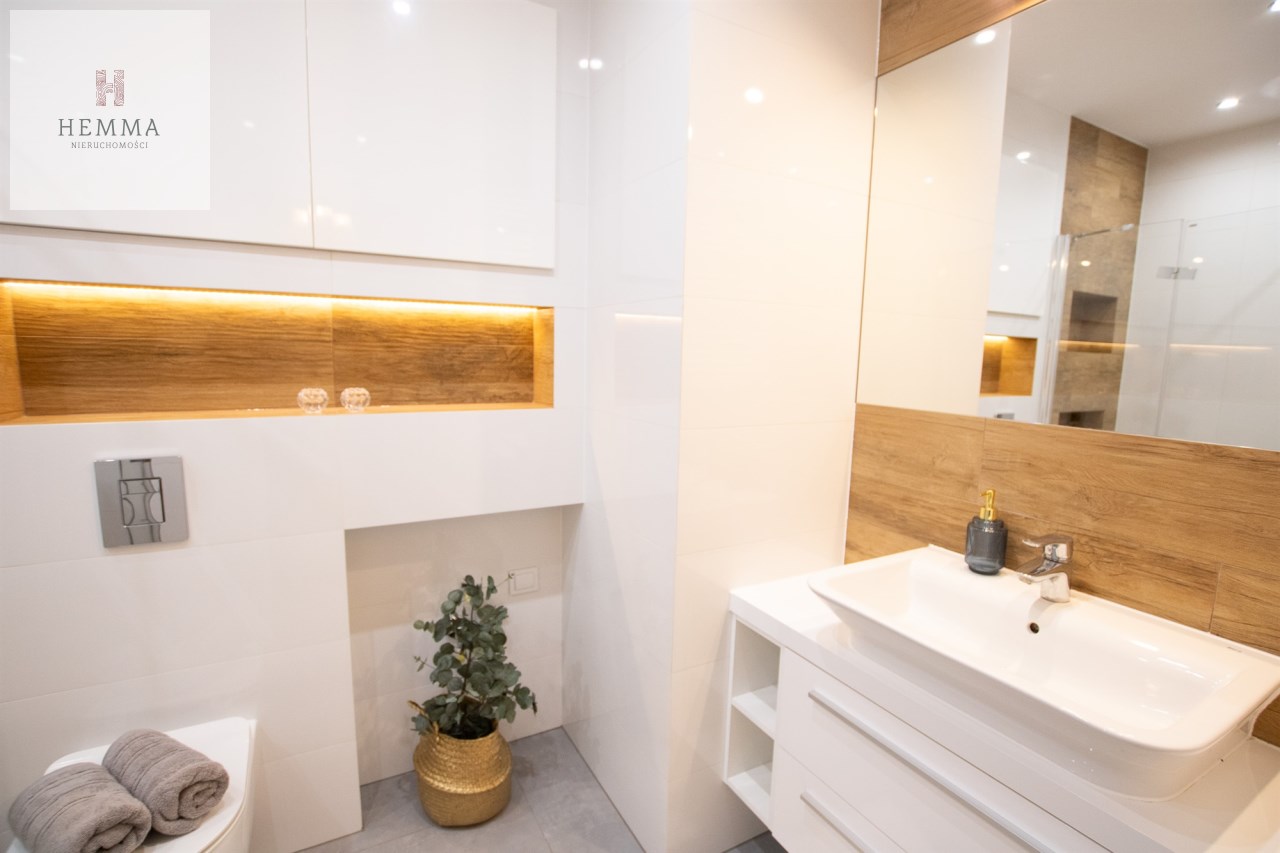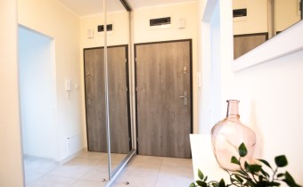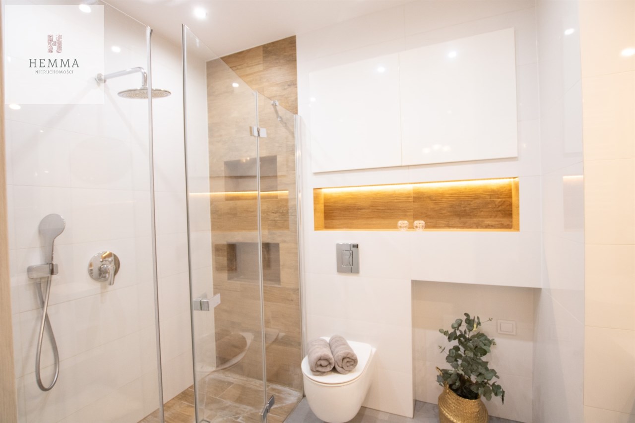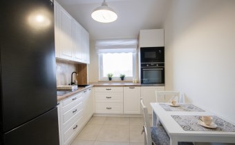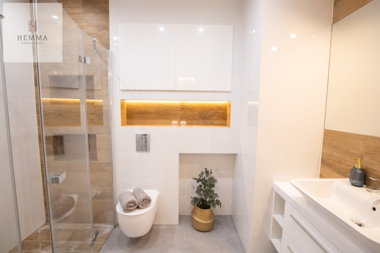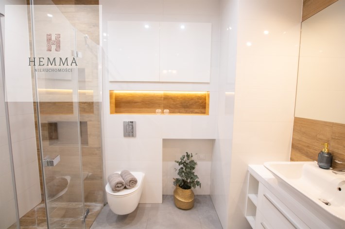 Mieszkanie o powierzchni 54,47 m2 , składające się z przestronnego salonu z wyjściem na balkon, z którego rozciąga się przyjemny widok na zieleń, oddzielnej kuchni, sypialni, łazienki oraz przedpokoju. Kuchnia w pełnej zabudowie z wyposażeniem, z której okna można podziwiać widok na jezioro. Łazienka jest przestronna i nowoczesna – znajduje się w niej duży prysznic z odpływem liniowym oraz miejsce na pralkę.