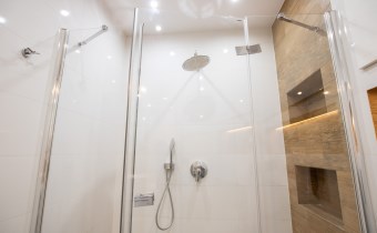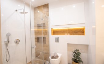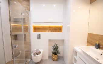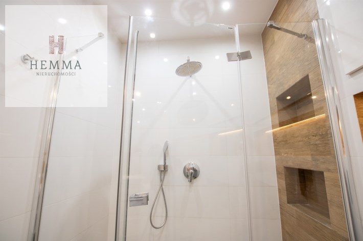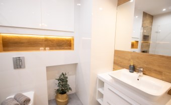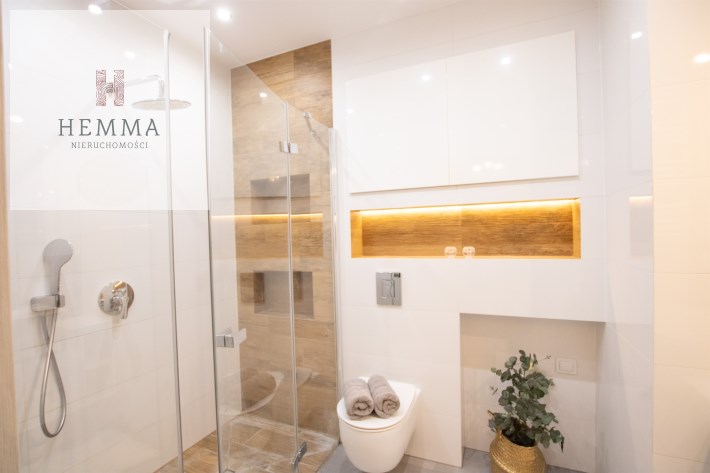 -Łazienka z WC - prysznic, szafka ze zlewem, miejsce na pralkę