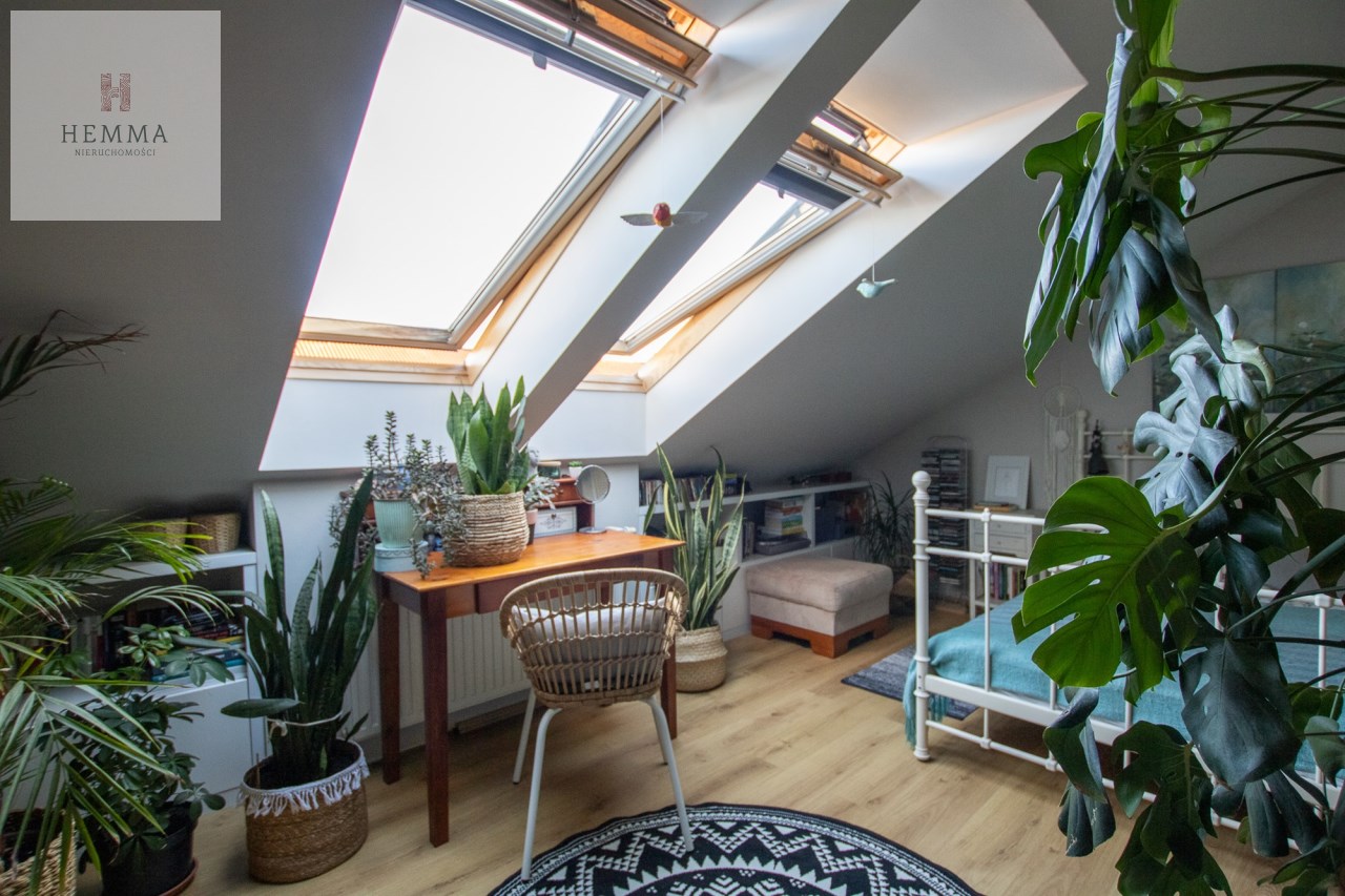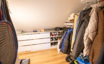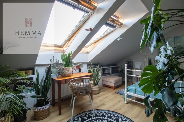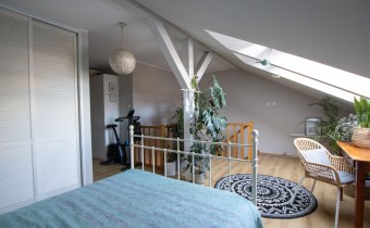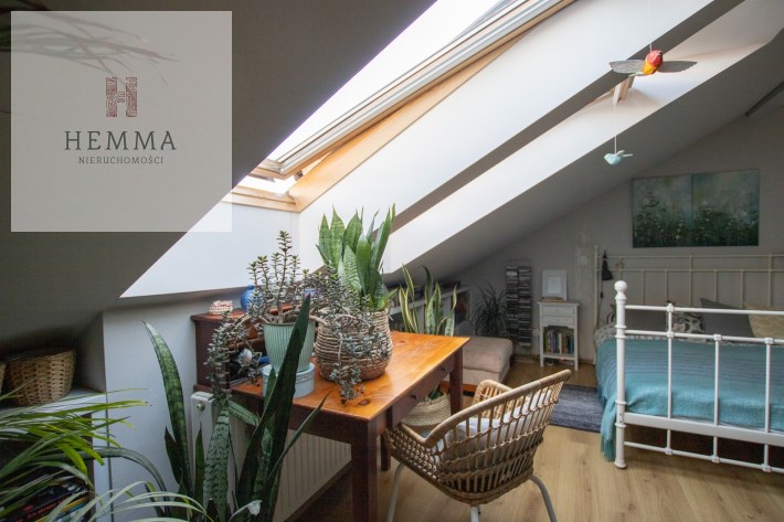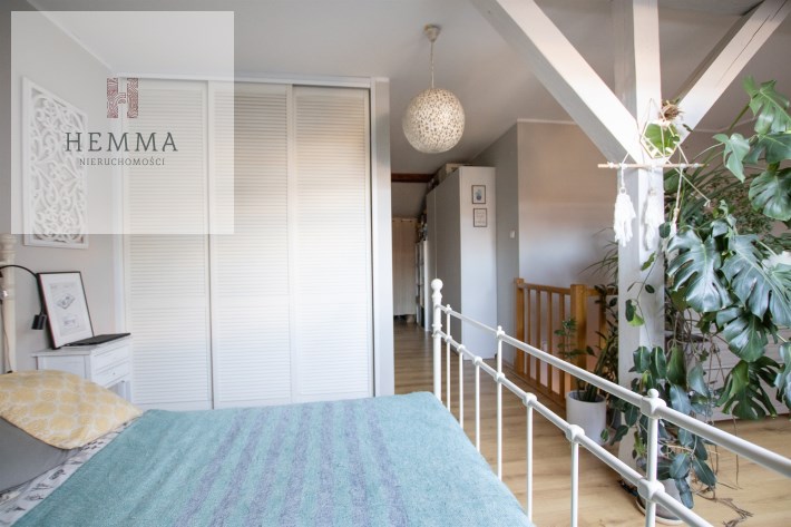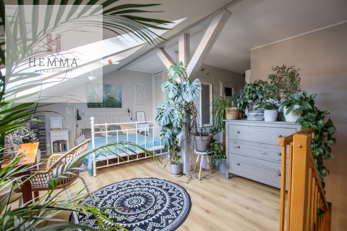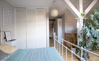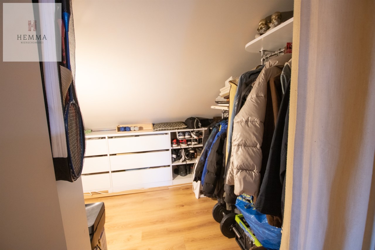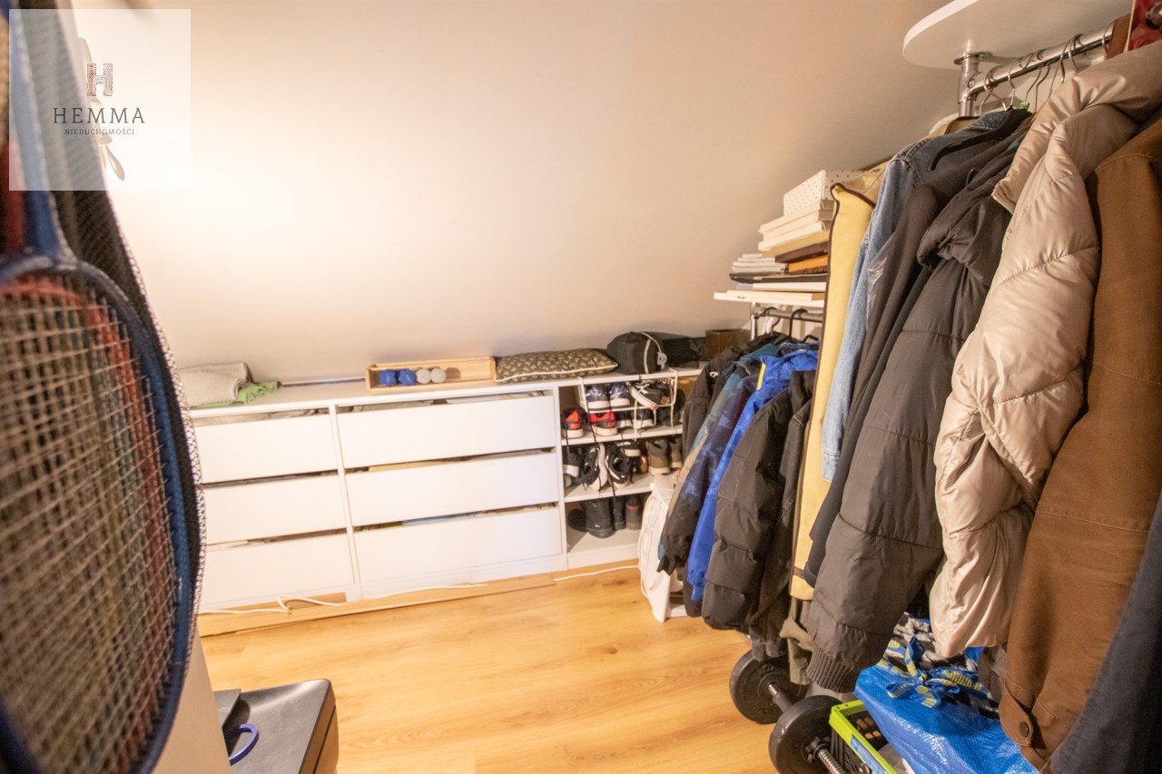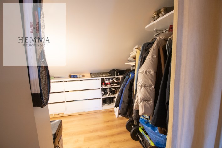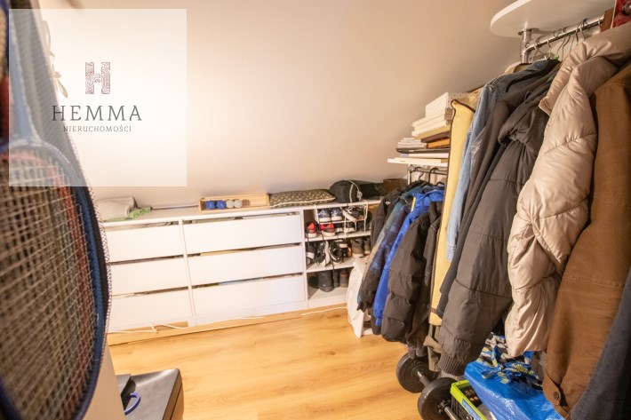 - Na poddaszu znajduje się garderoba, która zapewnia dodatkową, praktyczną przestrzeń do przechowywania.