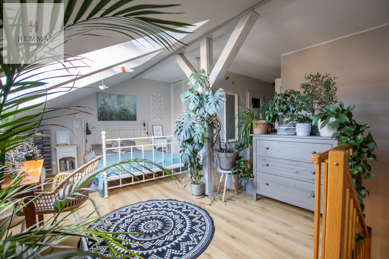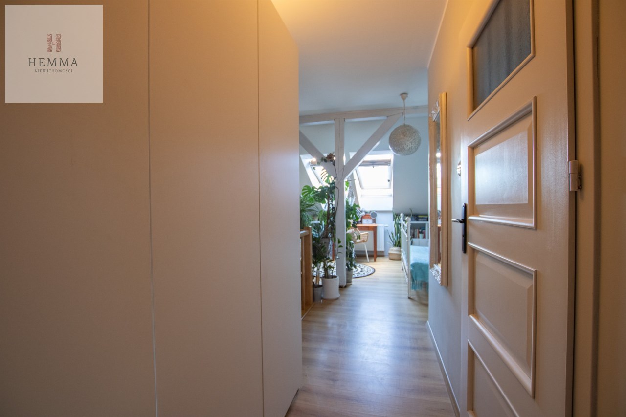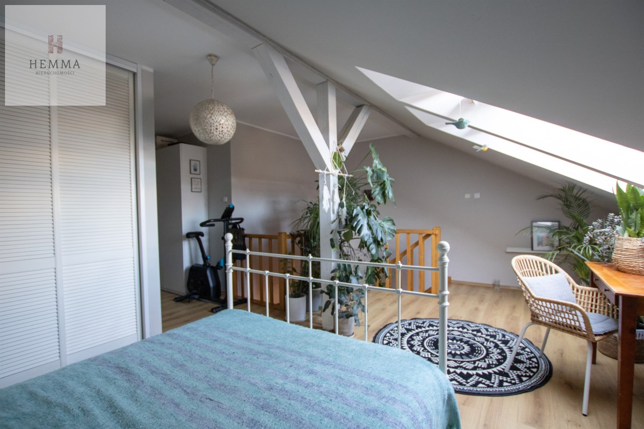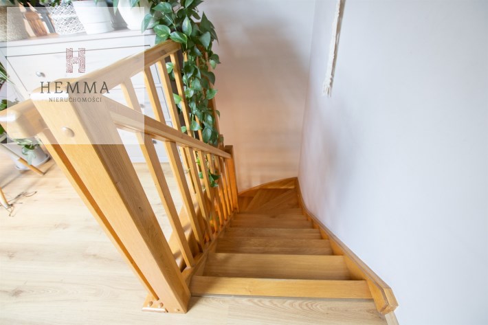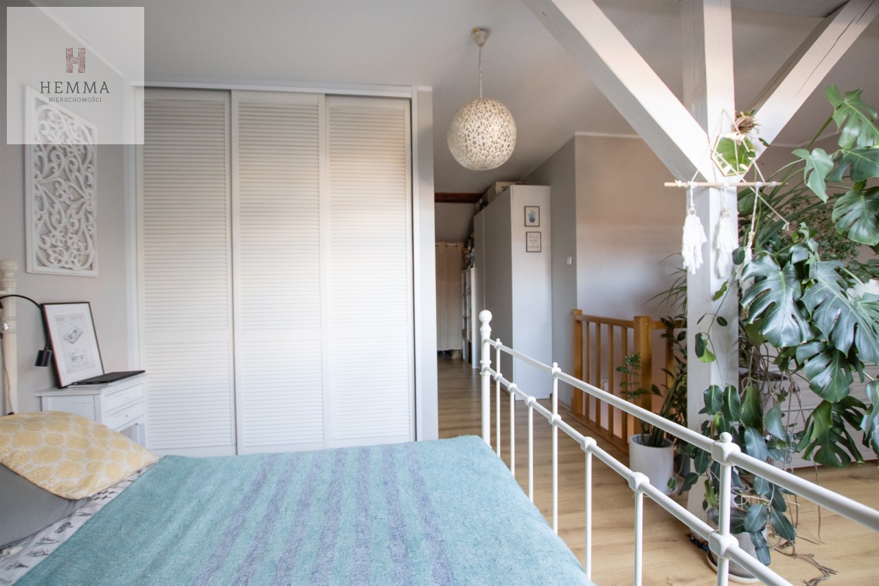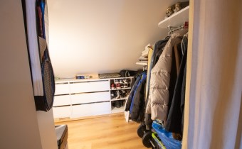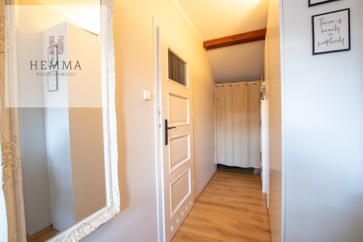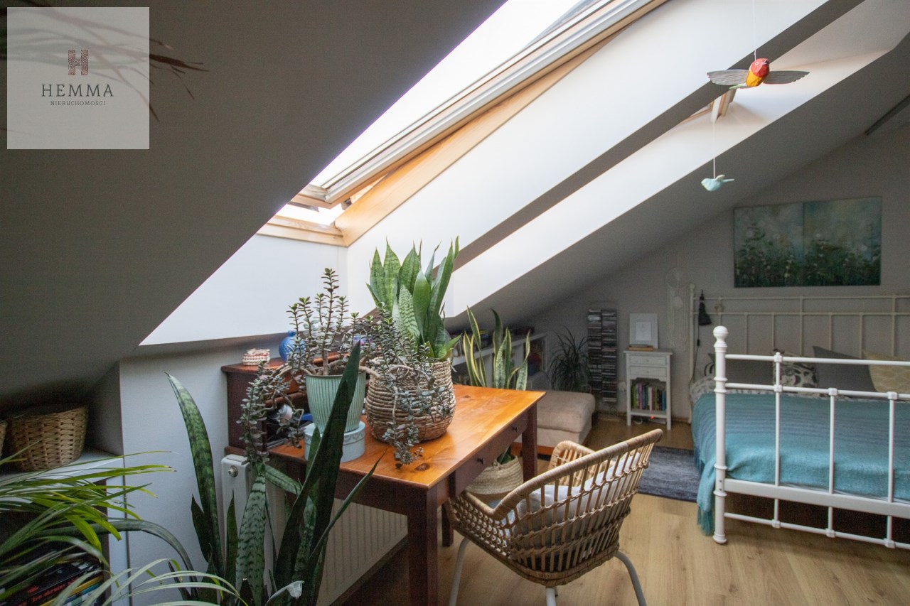 - Na poddaszu znajduje się garderoba, która zapewnia dodatkową, praktyczną przestrzeń do przechowywania.