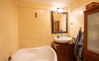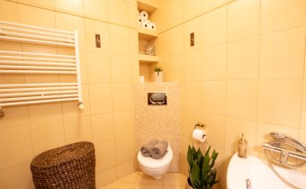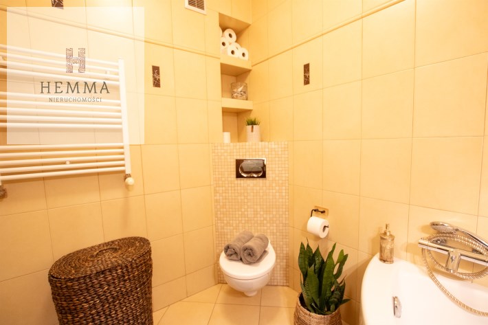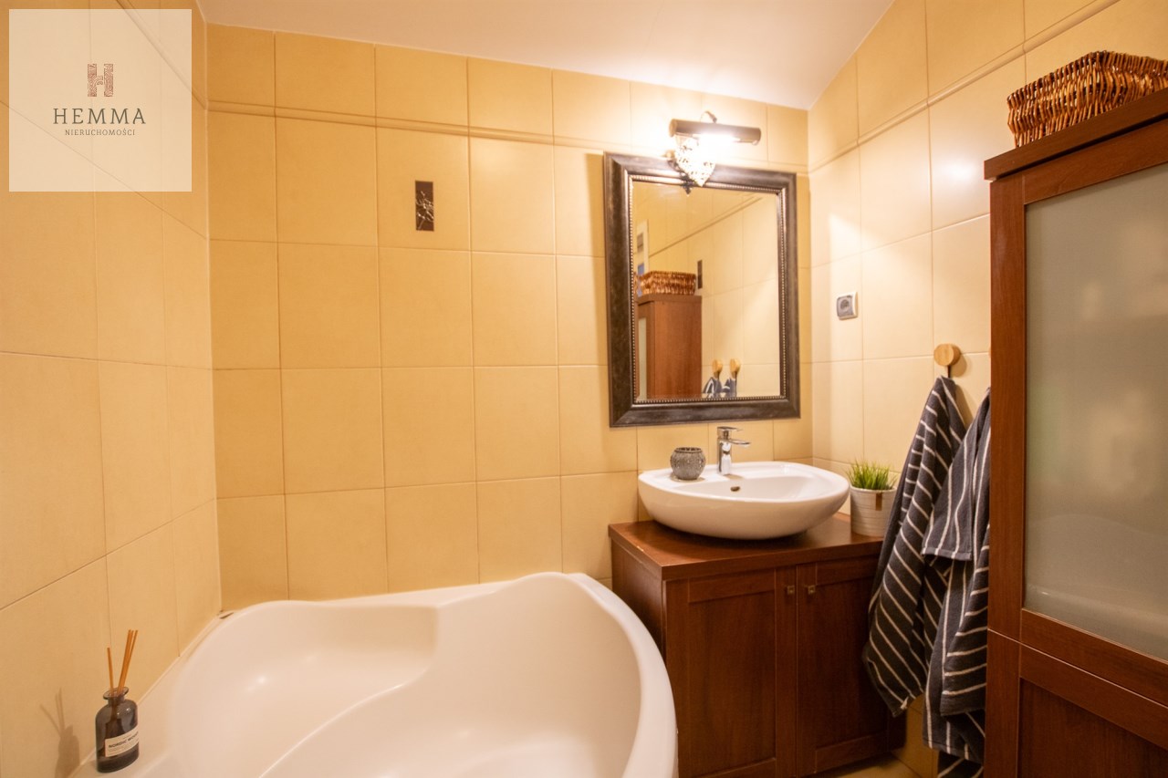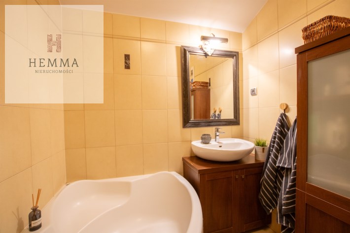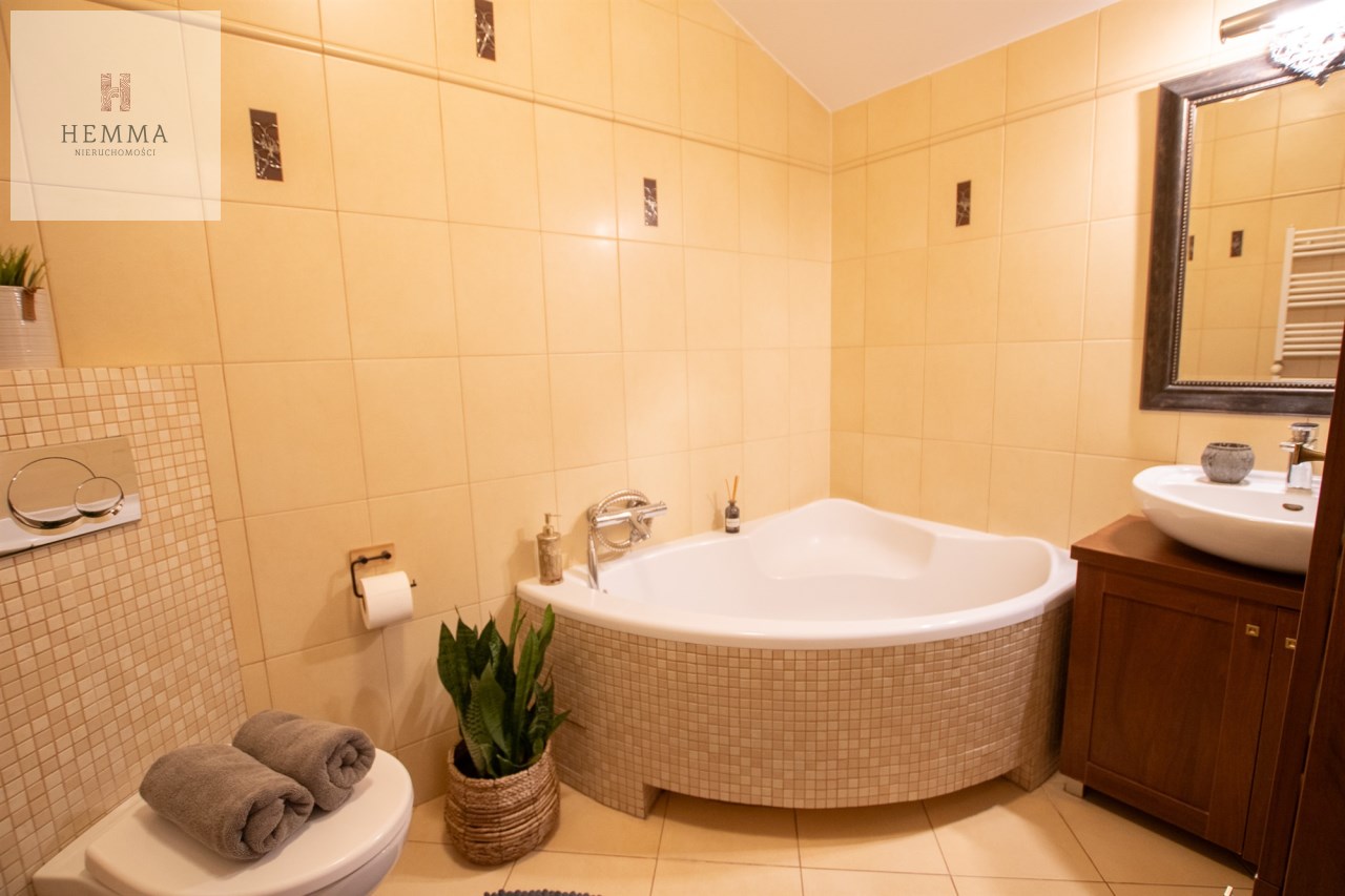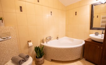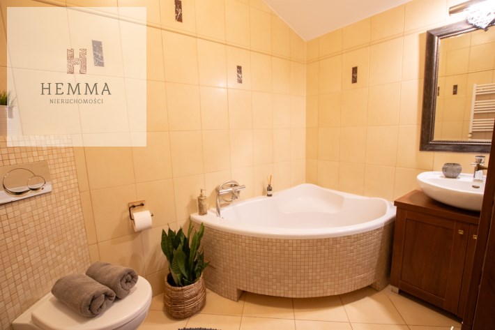 - Łazienka: Narożna wanna, umywalka z miejscem do przechowywania, wc