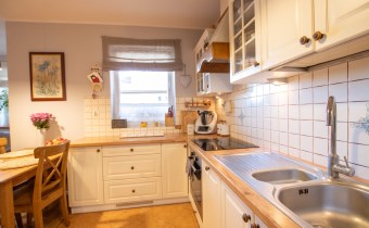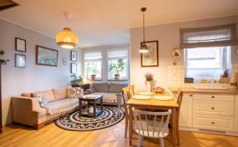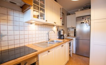 - Salon z aneksem kuchennym : Zabudowa meblowa, zmywarka, kuchenka z okapem oraz sofa. Atutem salonu jest bezpośrednie wyjście na duży balkon, który stanowi dodatkową przestrzeń do wypoczynku.